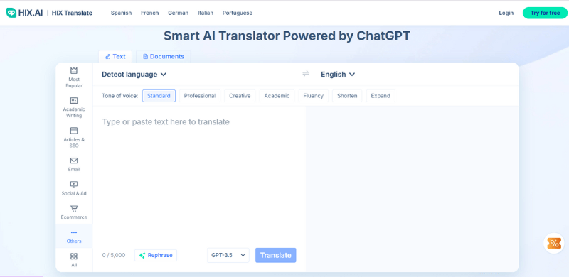 هو مترجم متطور مدعوم بتقنيات الذكاء الاصطناعي، يعتمد على قوة ChatGPT-3.5/4، مما يضمن تقديم ترجمة دقيقة، ويدعم موقع HIX Translate أكثر من 100 لغة، مما يجعله موقع ترجمة بالذكاء الاصطناعي مجانًا عالمي وشامل.