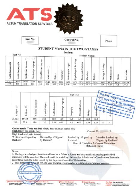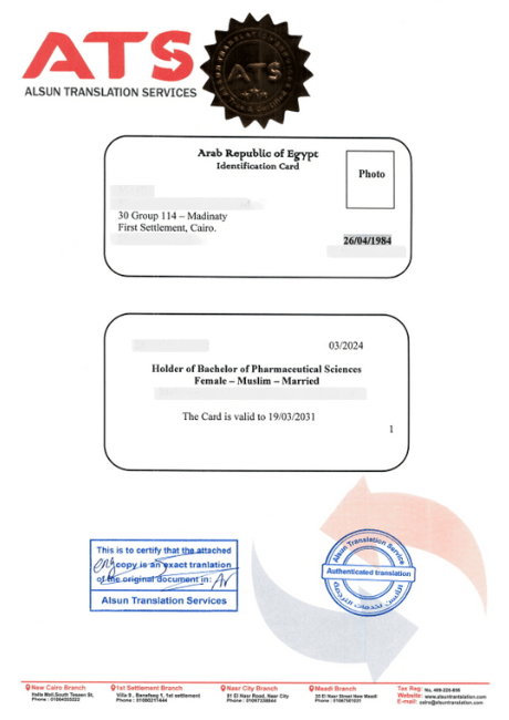 بعد الانتهاء من ترجمة المستندات الرسمية نضيف كل من (بيانات مكتبنا المعتمد، وختم الترجمة المعتمدة) للتأكيد على صحة الترجمة وموثوقيتها التامة؛ وتسهيل قبولها لدى الجهات الرسمية بكل أنحاء العالم.